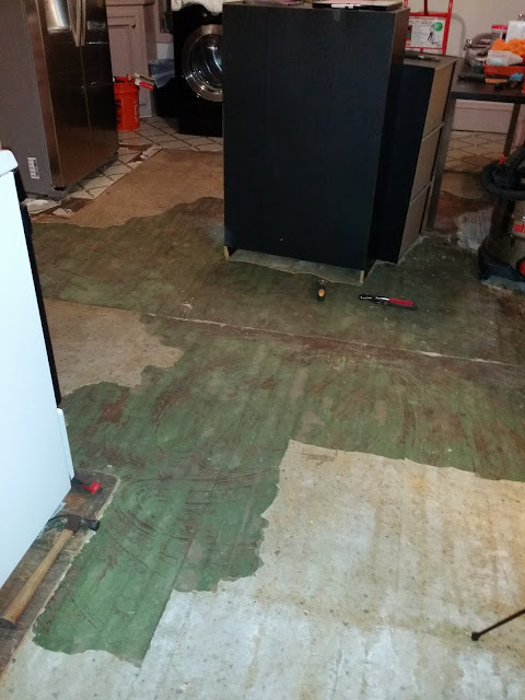 I want to point out here that the installer didn't use thinset or glue between the plywood and original floor, or thinset between the plywood and tile. Both not the best way to go about installing ceramic tile and also fortunate for us. Instead we found a layer of deteriorated tar/felt paper below the plywood, which had ground itself into the wood so significantly it was almost one.